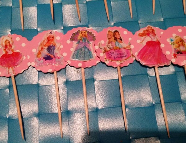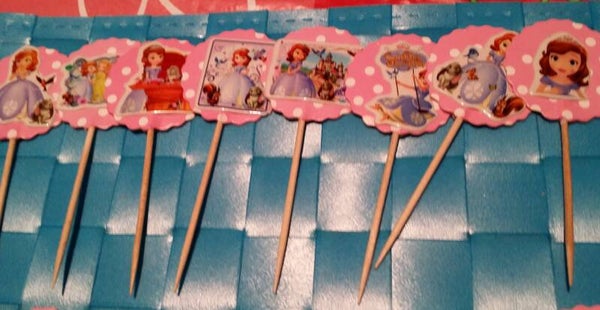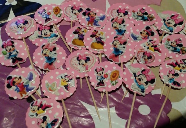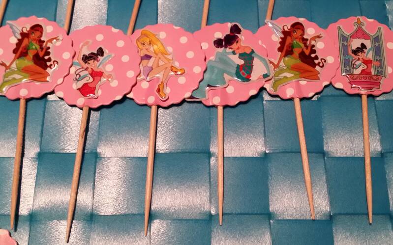 Topper di carta di 3,5x4cm circa con adesivo di un tema a scelta su entrambi i lati + bastoncino a scelta da 4 o 20cm (vedi opzioni), da usare come decorazione ad es. per torte (Cake / Muffin Topper) o come spiedino per frutta o dolci.